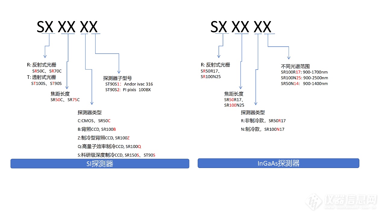 不同光譜儀型號命名規(guī)則遵循核心部件——探測器進行分類,C為線陣COMS探測器首字母縮寫、B為背照Back-Illuminated首字母縮寫、Z為制冷型背照CCD、Q為高量子效率Quantum efficiency、S為科研science的首字母縮寫。